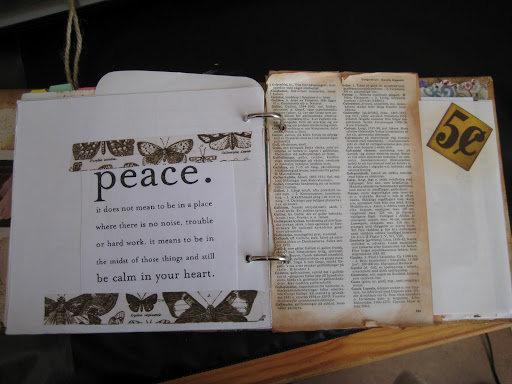 Texten Peace är från en Mindfulnessida som jag hittat och tejpen som håller den på plats är från Tim Holtz. Pappret till höger är ett som jag har rivit ut från ett lexikon och distressat kanterna på.