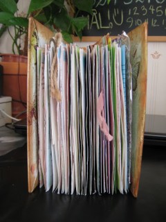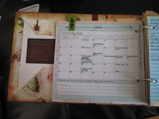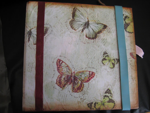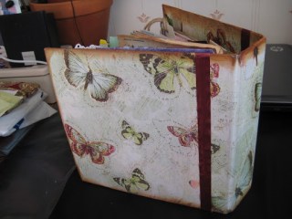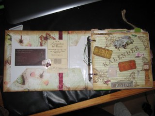 Jag provade att omvandla en gammal begagnad pärm (från Röda Korset) till en kalender och jag försökte att få fram ett vintagetema. Givetvis blev det fjärilar på omslaget och för att dölja en skarv satte jag dit ett vinrött band. Det turkosa gummibandet är från K&Company Smash* och dess syfte är att hålla ihop kalendern. Runt kanterna tog jag Distress Ink – Vintage Photo (Tim Holtz) för att få den där gamla looken (som jag har tidigare har nämnt). För att få längre hållbarhet på kalendern tog jag ett tunt lager med Allround Medium Limlak runt kanterna, vilket har i efterhand visat sig göra stor nytta.