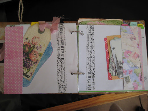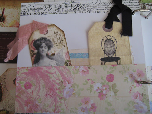 Av överblivet cardstockspapper gjorde jag två fickor och i dem satte jag en blandning av K&Company-papper som tillhör Smash*. Till vänster sitter en tag som jag vunnit på Tradera. Tejpen är från Tim Holtz.