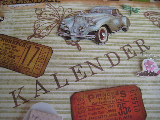 Här är några detaljer från förstasidan och bilen med mera är från ett ark med klistermärken som jag fått av mamma och som hon hade fyndat på Ullared. Biljetterna är från Tim Holtz.