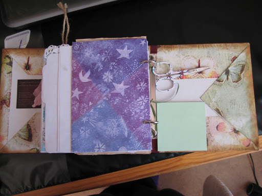 På sistasidan satte jag ett hemmagjort kuvert för att kunna lägga i lite allt möjligt smått och gott . Saxen är ett nödvändigt ting när man scrapbookar och därför var jag tvungen att skaffa en liten en. Hittade en i en sybutik för endast 39 kr. Post-it-lappar är även det ett måste att ha med sig.